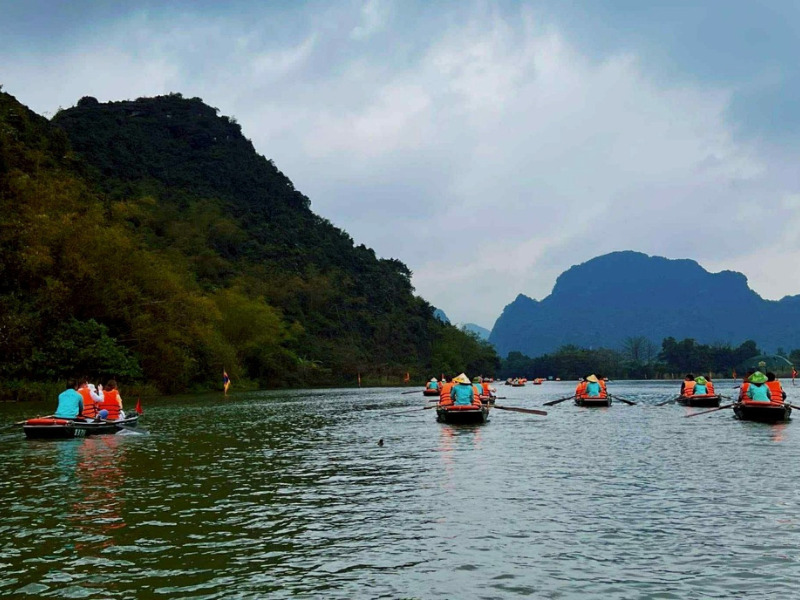 8:00にハノイを出発し、ニンビンへ向かいます(車で約2時間)。到着後は【チャンアンの観光スポット】を訪れ、ボートに乗って石灰岩の峡谷、清流、神秘的な洞窟、田んぼや川を訪れ、「陸のハロン湾」の雄大な景色を体験してください(サン洞窟、トイ洞窟、バジョーット洞窟など)。途中の景色は絵のように美しく、自然と文化が融合した世界遺産の名所です。船旅全体の所要時間は約 1 時間半から 2 時間で、ゆっくりとリラックスできます。